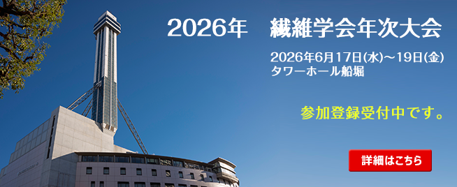 繊維学会年次大会 2026年6月17日-19日 繊維学会秋季大会 2026年11月5日-6日 夏季セミナー 2026年9月10日-11日 繊維応用講座 本年度は終了いたしました 繊維基礎講座 本年度は終了いたしました 繊維技術講座 中止のお知らせ 高校生研究発表会 本年度は終了いたしました